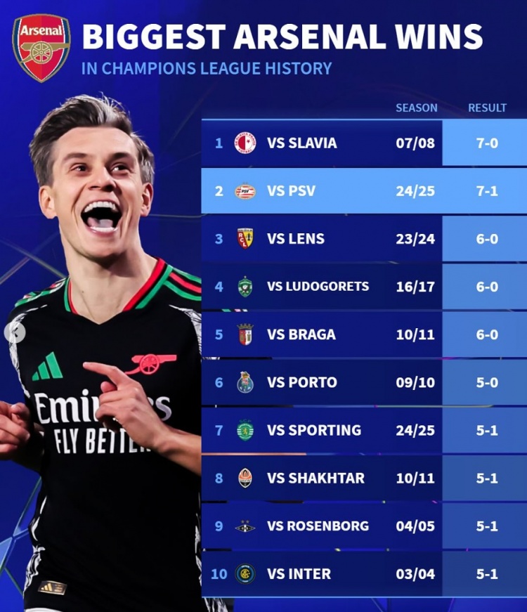 3月5日讯 欧冠16强战首回合比赛已经先赛4场,阿森纳作客7-1痛击埃因霍温。《转会市场》也列出了阿森纳队史欧冠单场最大比分胜利情况。